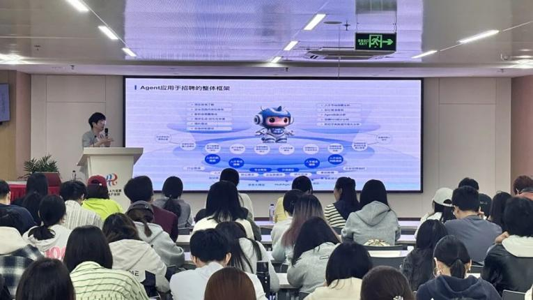 在参观的最后环节,淮海人才集团副总经理李勤奋老师为同学们带来了主题为《人力资源管理大数据与智能决策》的精彩讲座。讲座中,李老师结合实际案例,深入阐释了AI技术在人力资源领域的应用,并启发听众们的思考:在人工智能时代,大学生应如何提升自身核心竞争力,避免被技术浪潮所淘汰。讲座内容生动且富有启发性,引发了热烈的讨论与思考。