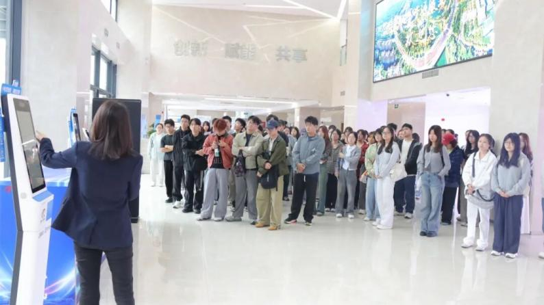 到达园区后,全体师生首先在讲解员的引导下参观了园区展示大厅,并亲身体验了“1号求职机”。通过实际操作,同学们直观感受到人力资源数字化服务的高效与便捷。随后,产业园运营中心主任刘吟雪老师详细介绍了园区的总体布局与发展情况,重点讲解了“人力资源大数据分析平台”的五大功能模块。通过这些介绍,同学们了解到该平台如何利用数据挖掘技术,实现就业岗位的精准匹配,为人才服务与企业招聘提供了强有力的支持。