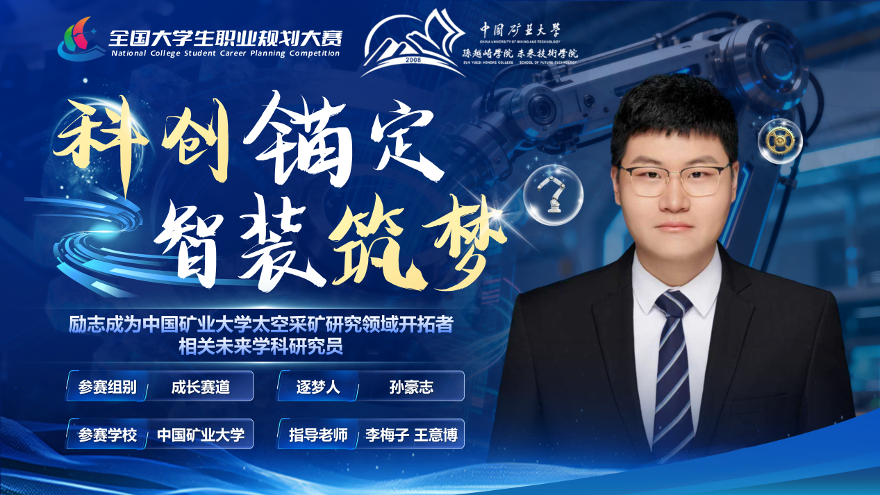 孙豪志,男,2023级理工特色2班机械工程专业本科生,综合素质测评连续两年位列学院第一,获2025年中国矿业大学特等奖学金。主持国家级、省级大学生创新创业训练计划项目4项,发表及投稿中科院一区TOP期刊等论文5篇,授权与申请专利10项。获中国国际大学生创新大赛等国家级、省部级奖项22项,其主持的太空采矿项目获央视专题报道。